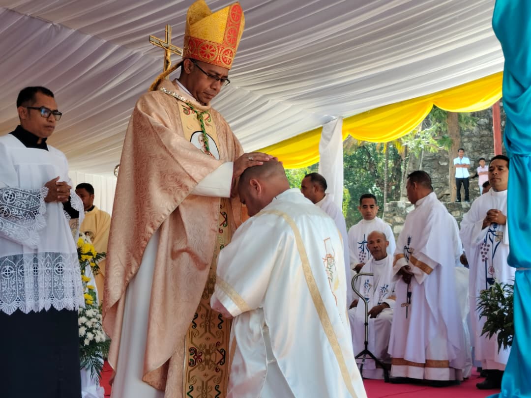 BAUKAU, STLTIMORLESTE.com – Bispu Diozese Baukau Dom Leandro Maria Alves fo ordenasaun ba Diakonu Juvinal Gusmão iha ambitu selebrasaun festa Santa Terezinha do Menino Jesus