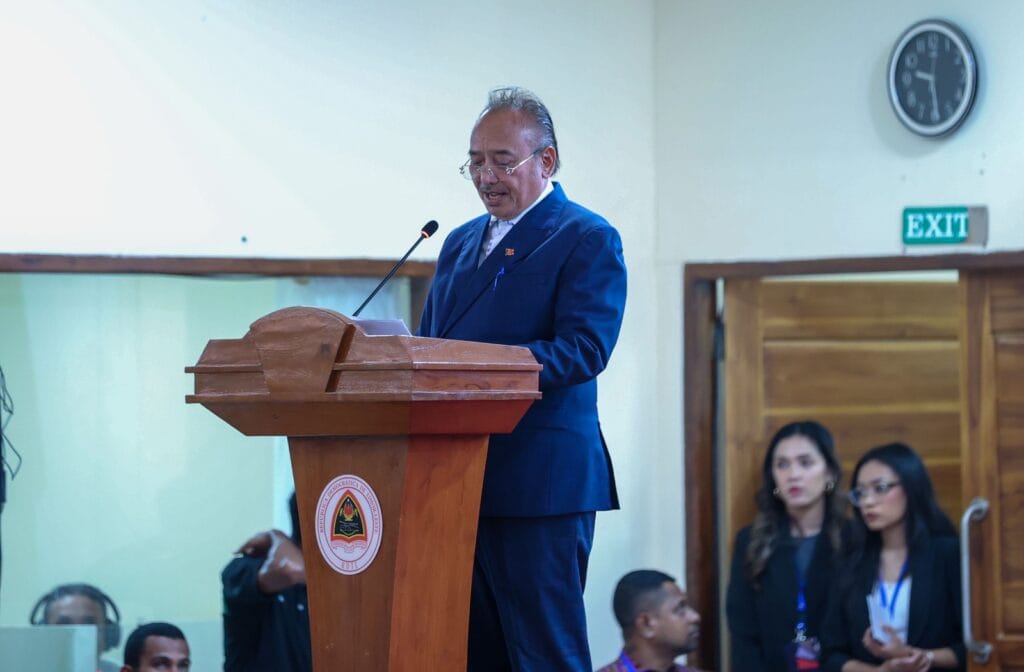 Visi Primeiru Ministru, Ministru Koordenadór Asuntus Ekonomikus no Ministru Turizmu no Ambiente, Francisco Kalbuadi Lay deklara iha diskursu abertura sesaun daruak Konferensia APCC iha CCD Díli, Sabadu nee (28/06/2025).