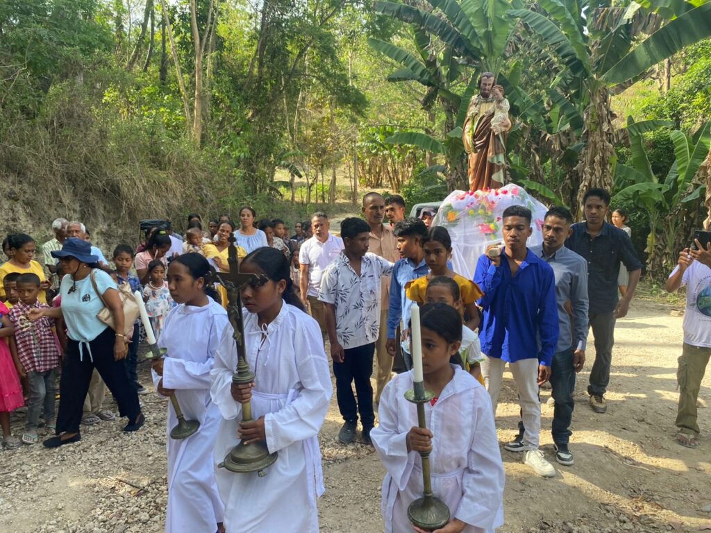“Bemvindu Aman doben Saun Jose, Ohin ita hit aan mai iha ami nia bairru ida nee, ami tuku tuur ho fuan simu ita mai hela hamutuk ho ami. Aman doben Saun Jose, ho ita nia vizita ida nee, lori esperansa mai iha bairru ida nee, halakon ami nia arogansia neebe ami iha, hadook ami husi laran makerek sira, hadook ami husi foti aan sira, mai ba lori esperansa ksolok haraik aan, unidade, dame no pas iha ami nia bairru ida nee liu liu ami nia aldeia Waiwatu,Aman doben saun Jose mai ba, Aman doben, mai hela ho ami aman doben, ami simu ita ho fuan tomak, no hahi ita tanba ita neebe hetan premio lalehan tanba sai aman neebe simples obidese, no pasensia hodi hakiak ami nain Jesus, ita hadomi knaar loron loron nuudar dalan atu hetan santidade, iha ita nia vizita ida nee husu haraik grasa ba ami nia aman sira sai ezemplu tuir ita boot nia attitude,” dehan Nalcia liu husi orasaun simu, iha Bairu Badulu, Sabadu (25/10/2025).