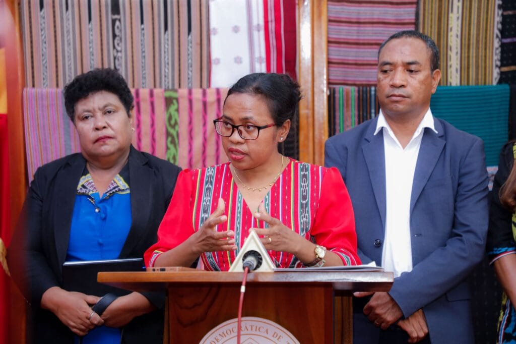 Kestaun nee hatoo husi Sekretaria Estadu ba Igualdade, Elvina Sousa Carvalho ba jornalista sira bainhira remata halo enkontru ho Prezidente Republika Jose Ramos Horta iha Palasiu Prezidensial Nikolao Lobato, Bairo Pite, Kinta lokraik (12/06/2025).
